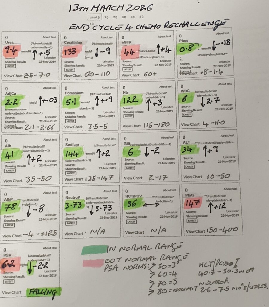 Once home I bring bins in, fill bird feeders and try to do some work. My partners mother has fallen out of bed and so there is a lot going on with getting an ambulance to take her to A&E. I book my 28 day injection time at the GP surgery and negotiate a time to get my hospital bloods done. Just as I think I have things under control a crown falls out of my mouth. I ring the dentist and make an appointment for Friday, putting the errant crown in a specimen bottle and washing it with Listerine. I could have done with out this. My partner messages at gone 4 o’clock to say the ambulance has just arrived to take her mother to A&E and that her brother and she are returning home. I draft the blog. I will not be going to the theatre tonight to see Mama Mia, I am knackered, I have no energy left. The rest of the family can go, I shall rest and prepare for a trip to have my nails done tomorrow. All I want to do is sleep but but I know there are things to do this evening before I can get to bed. There will be night meds and then hopefully sleep. Despite chemo rechallenge life just marches straight on.