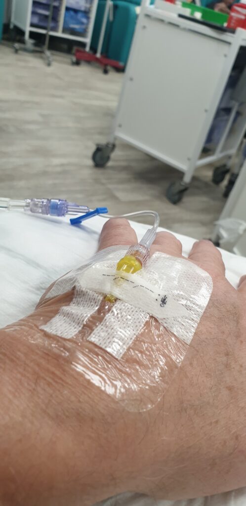 Blood pressure all good and off we go! What happened next was a complete and utter surprise and shock. I went into a full blown allergic reaction! By body responded as if filed with fire and I my head spun lightly and I knew I was going to loose consciousness. Typically I thought. “Fuck me this is a bit of a rush” but apparently had enough sense to hail the nurse and mutter feebly “I am feeling very feint”. I’ve never seen so many nurses move so fast. In an instant I had five around me, my chemo IV lead was taken out and they pumped my with antihistamines and corticoids and of course a lot of saline. I recovered miraculously fast, just like in the films when some one goes down with an anaphylactic shock and they get jabbed with adrenaline, the recovery is instant and so it was with me. The lead nurse explained what had happened and we chatted about this never ever happening to me before and that this was my second cycle. He said it sometimes takes two or three cycles for this to happen. They all agree I have recovered well, so I ask “can we get on with it now”. The nurses says that will give me saline for 30 minutes and talk to the doctor. I stress that I am keen to continue. When he comes back they tell me that they will finish the session but the rate of infusion will be over two hours. “Fuck” I think “that means a long time to go with out a piss”. Faced with the reality I of course manage to last the course, which probably says more about my levels of anxiety than anything else.