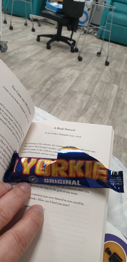 So by about six o’clock I am the only one in the chemo suit apart from a poor woman who has had a fall and is in a side room. A sort of lodger in oncology while the nursing team and doctors try to find her a bed for the night, which is proving to be a tricky task, clearly bed managers are the kings and queens of any hospital. So I am alone with a Yorkie to see me through my long session and of course Toha’s poetry.