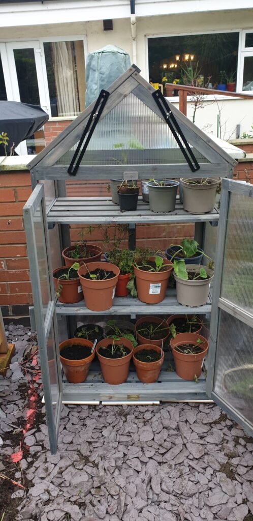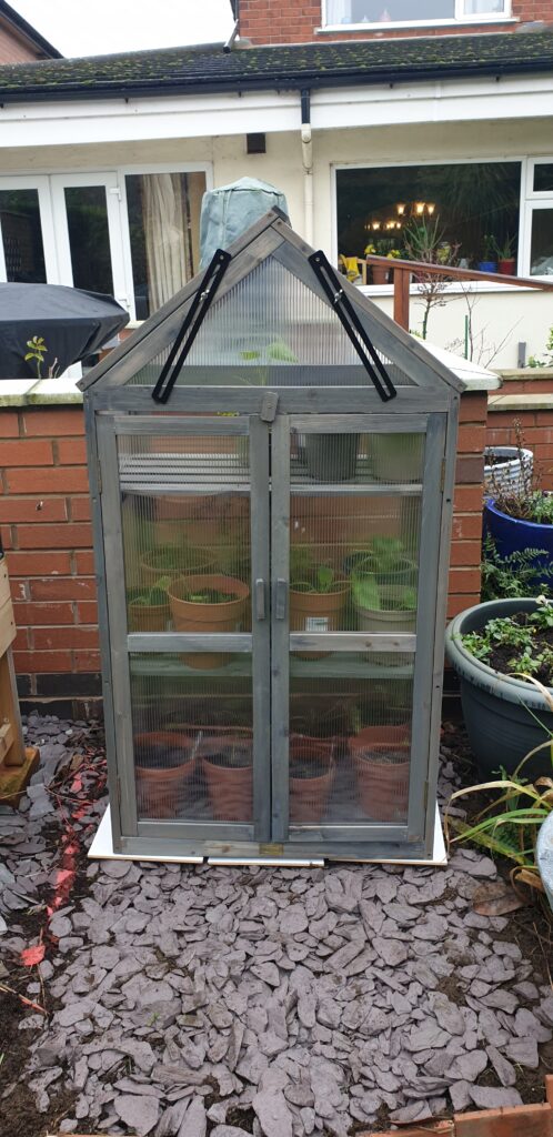 After some jiggling about with the doors I finally get the project finished and its time to get my eldest daughter to be the human forklift and take it into the garden for me. With the mini greenhouse sitting on the tile base on the shale bed it’s time to transfer the autumn plantings to it so that they can continue to grow and to free one of the raised bed propagators for the January seed sewing’s. So it seems that all is going to plan and the strategy for filing the garden pots and beds is on course.