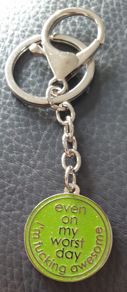 Out of the blue my eldest daughter gives me a present. I open the Amazon envelope and I find a wizard key ring (can never have too many). It makes me laugh and smile and and also think “too right that’s me”.